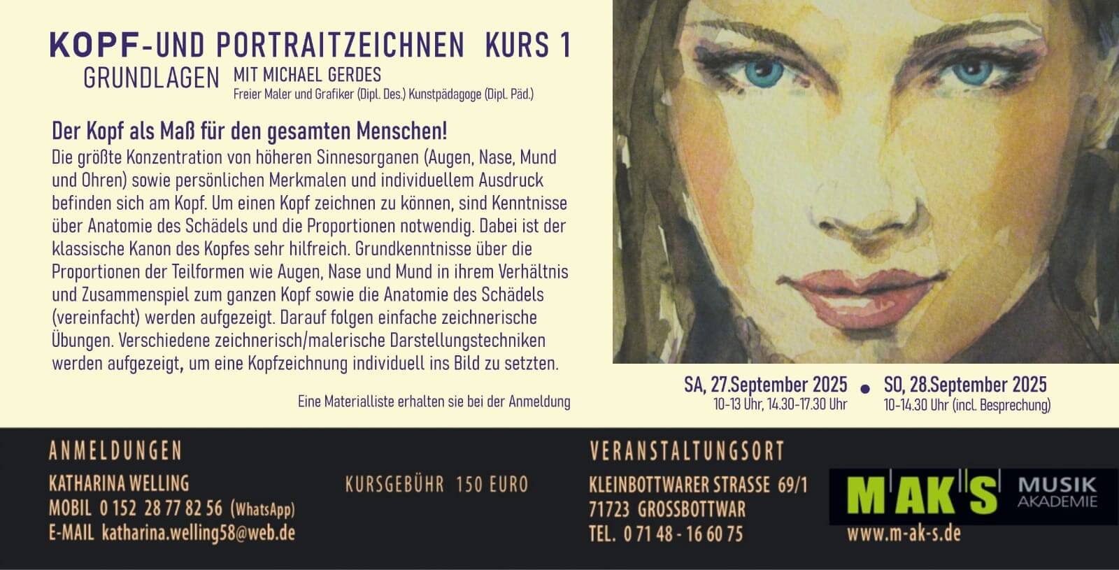 An diesem Wochenende werden die Grundlagen einer Kopfzeichnung im Profil erläutert und geübt. Das Zusammenspiel der Teilformen, Augen, Nase und Mund sind im Wesenlichen auf die Seitenansicht eines Kopfes übertragbar. Es wird der zeichnerischer Aufbau der Teilformen in ihren Verhältnissen und Proportionen im Einzelnen und in Gesamtdarstellung eines Kopfes im Profil vermittelt. Hilfreich ist dabei der klassische Kanon in der 7er-Teilung. Verschiedene zeichnerisch/malerische Darstellungstechniken werden aufgezeigt, um eine Kopfzeichnung im Profil individuell zu gestalten. Beispiele aus der Kunstgeschichte können Inspiration für die Umsetzung eigener Profildarstellungen eines Kopfes sein.